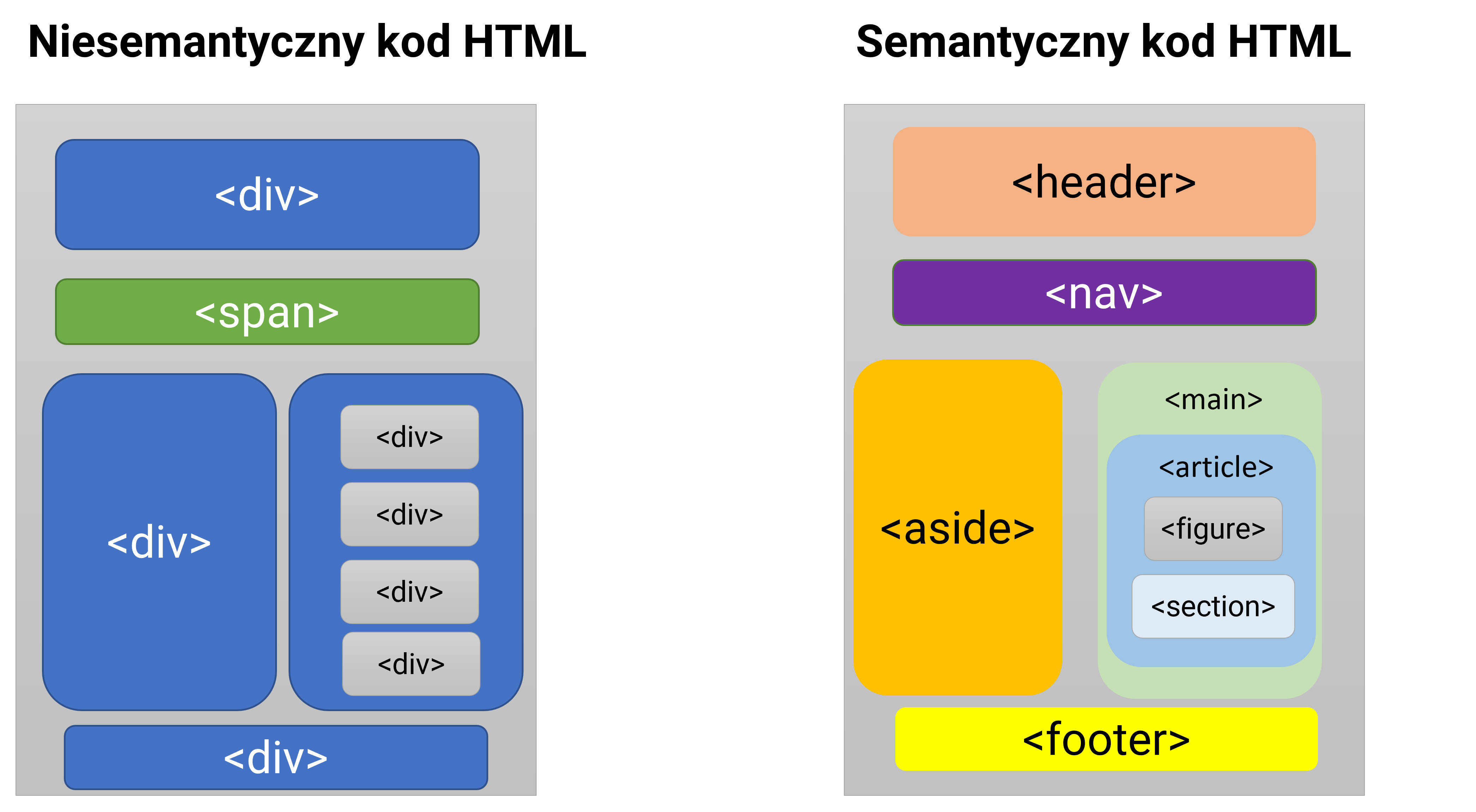 Najczęściej gdy mówimy o tym żeby pisać semantyczny kod na przykład HTML to chodzi o to żeby używać takich znaczników, które w jak największym stopniu odzwierciedlą znaczenie danej sekcji lub elementu. Przykładowo do tworzenia nagłówka powinno używać się znacznika <header> zamiast zwykłego kontenera czyli diva, który nie ma znaczenia semantycznego. Jest po prostu pojemnikiem do którego wrzucamy jakąś treść.